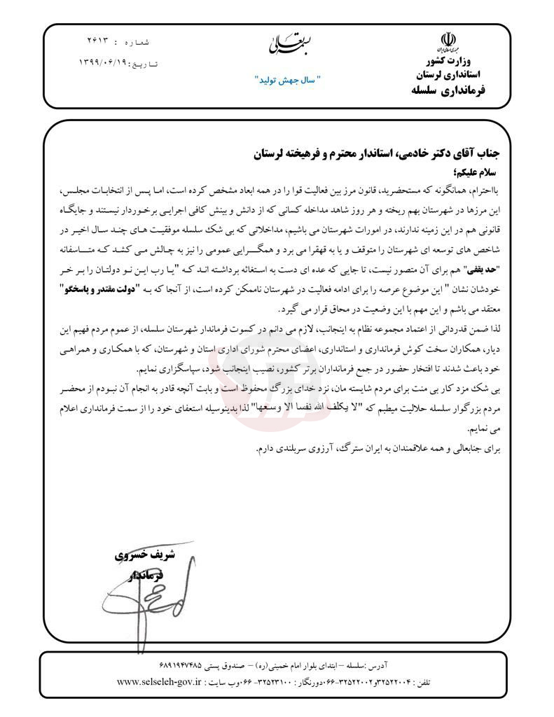 به گزارش خبرنگار زرک؛ «شریف خسروی» فرماندار سلسله، با ارسال نامهای به استاندار لرستان از سمت خود استعفا داد و علت آن را دخالت برخی افراد در امور شهرستان عنوان کرده است.
