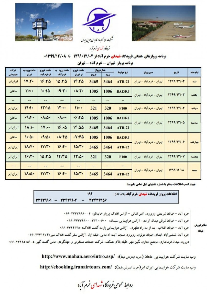 برنامه پروازهای هفتگی فرودگاه شهدای خرمآباد