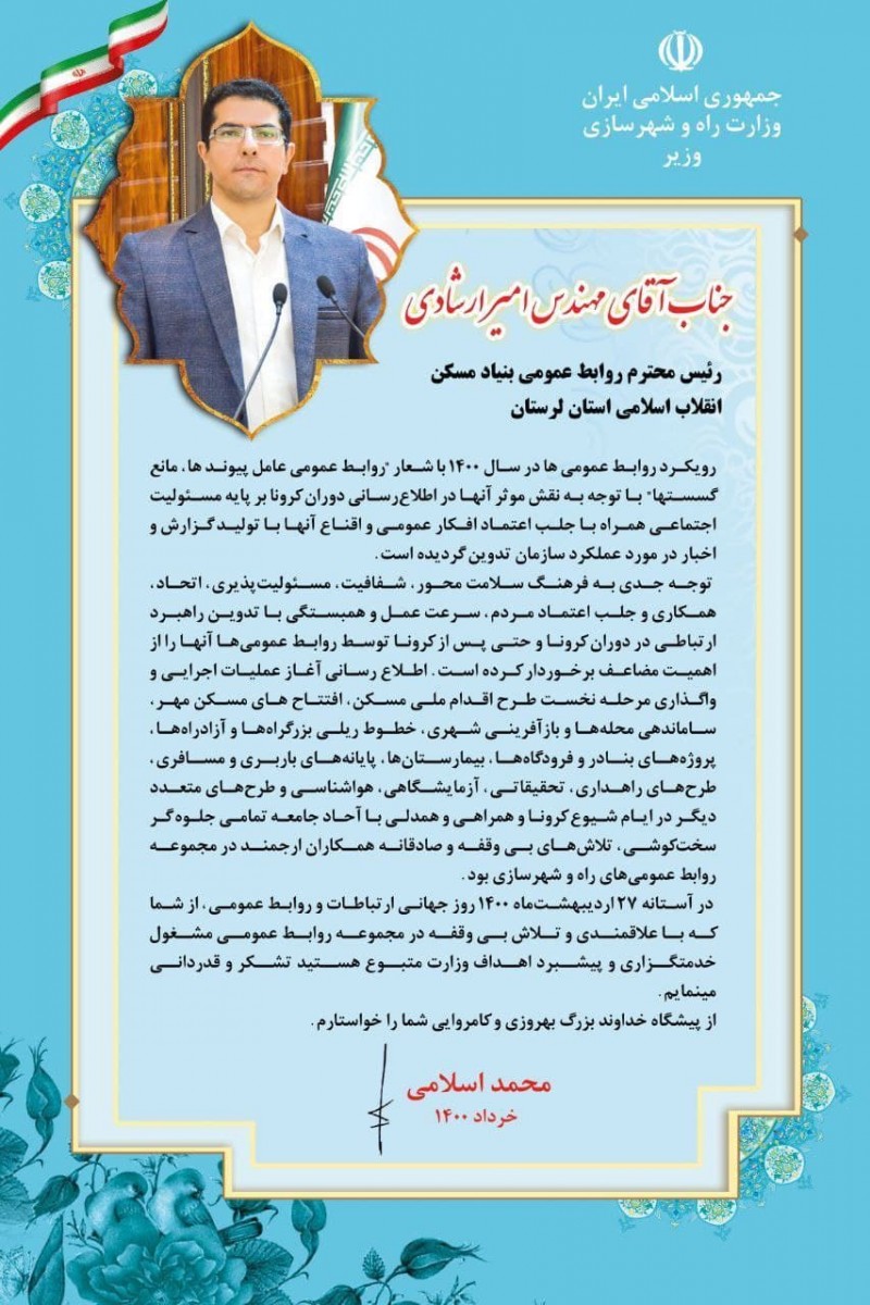 وزیر راه و شهرسازی از مدیر روابطعمومی بنیاد مسکن لرستان تجلیل کرد.