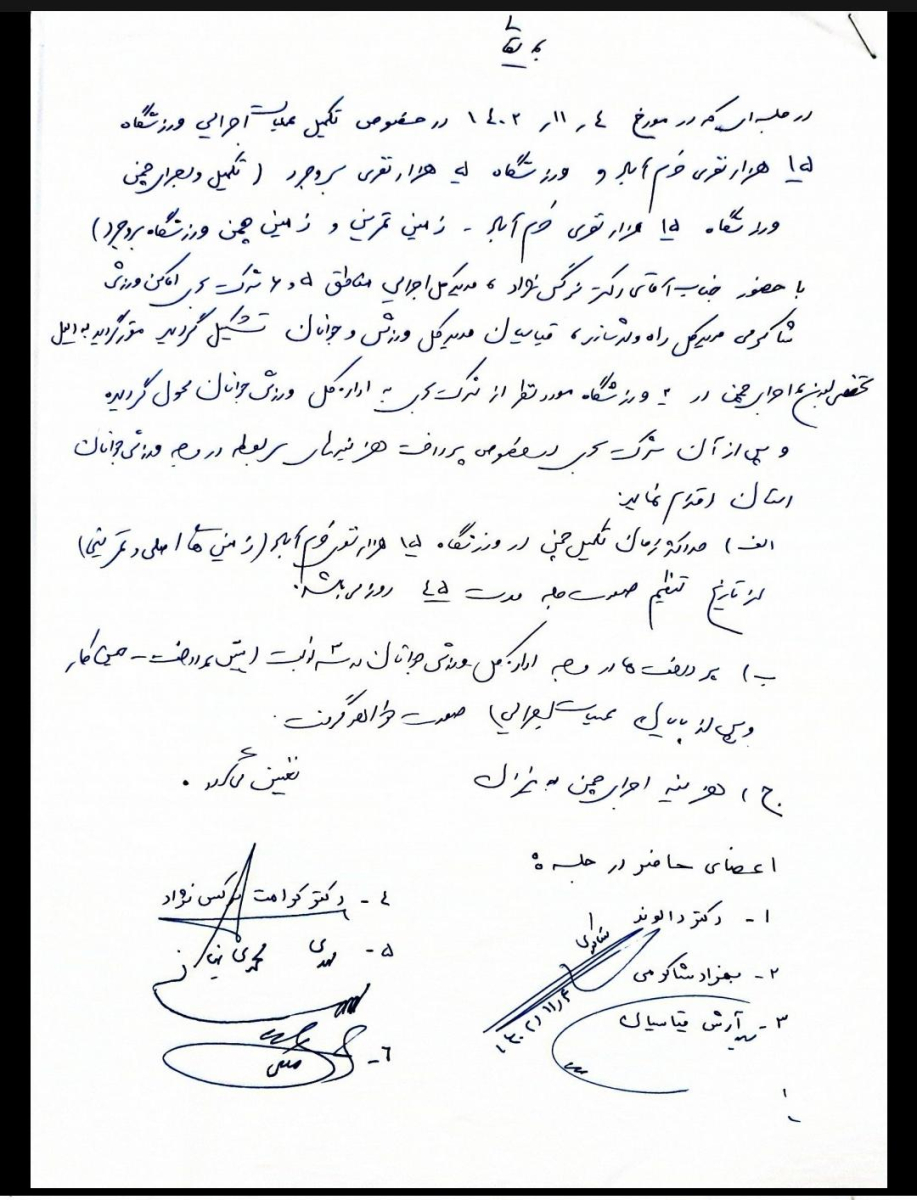 شاکرمی با بیان اینکه در این جلسه نمایندگان سازمان مجری ساختمانهای دولتی، معاون استاندار، مدیرکل ورزش و جوانان و سایر مسئولان حضور داشتهاند، افزود: «بر اساس توافق انجامشده، اداره ورزش موظف شد ظرف ۴۵ روز نسبت به تعویض یا بازسازی چمن مسابقاتی و تمرینی اقدام کند، اما متأسفانه تاکنون هیچ اقدامی از سوی این نهاد انجام نشده است.»