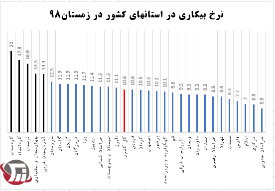 به گزارش پايگاه خبري زرك، براساس اين نتايج، بیشترین نرخ بیکاری در زمستان ۹۸ به استان کردستان با نرخ بیکاری ۲۰ درصد تعلق گرفته است. استان كرمانشاه با ۱۷.۹درصد رتبه دوم بيكاري را به خود اختصاص داده است. لرستان نيز با نرخ بيكاري ۱۶.۸ درصد مقام سوم را كسب كرده است.